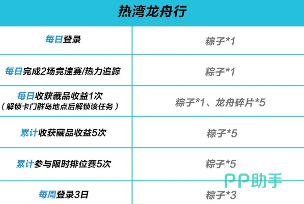 首先是热湾龙舟行活动,时间从5月31日开始到6月19日结束,在这个期间每天都会给大家发布,例如每日登录、参与5次排位赛等等小任务,只要完成相应的任务就能获取到龙舟碎片和粽子。