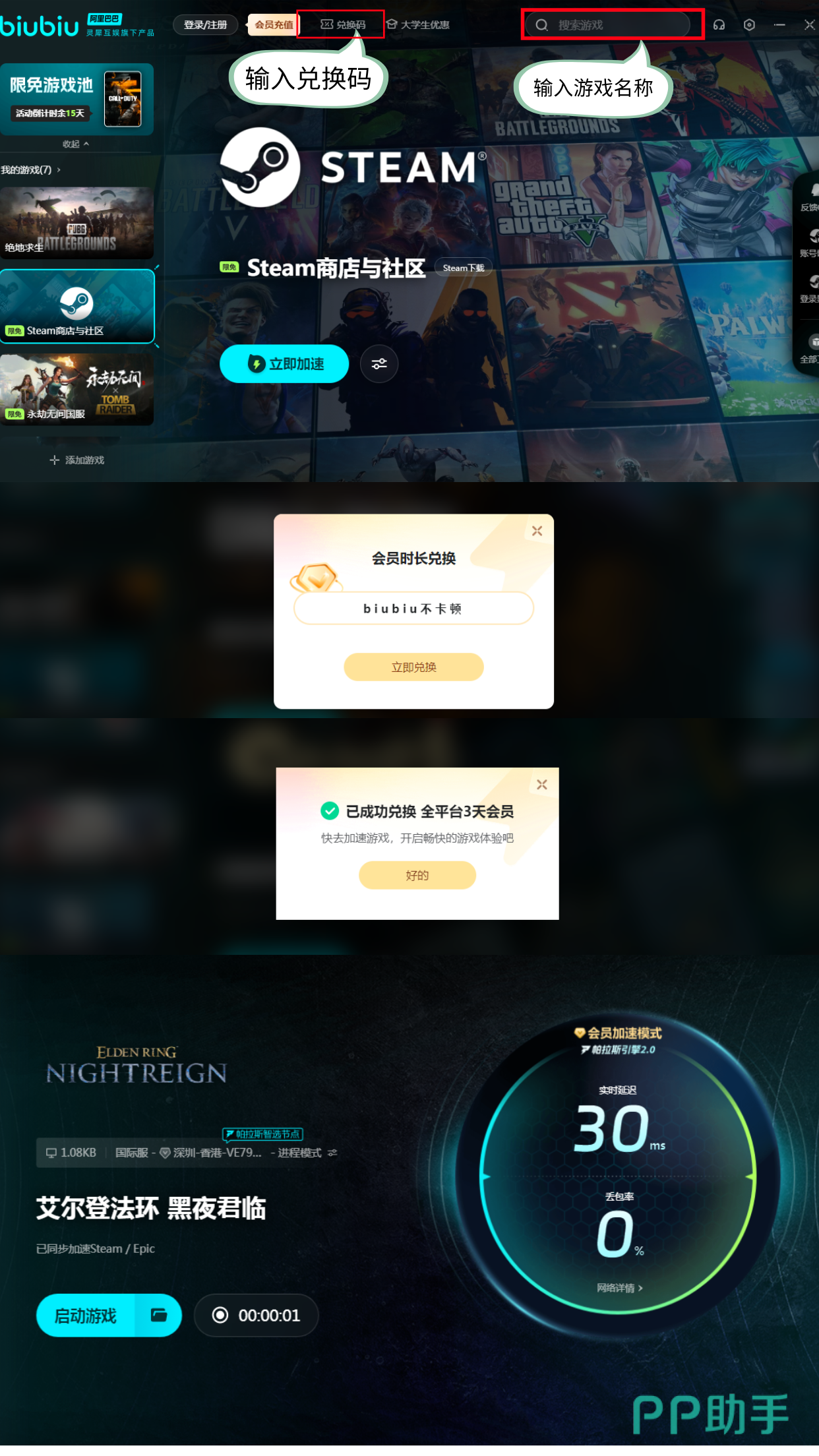 上方给大家推荐的加速器可以让小伙伴们轻松给游戏加速,现在biubiu给黑夜君临提供了限免服务,在5月30号到6月13号期间提供限免加速,去玩这个游戏的话是不需要付费就可以直接加速的,联机组队不掉线。如果是新用户初次接触这个平台,那么可以直接得到24h体验提速的机会,此外还额外给大家提供了3日的体验时长,只需要输入【biubiu不卡顿】即可轻松到手。