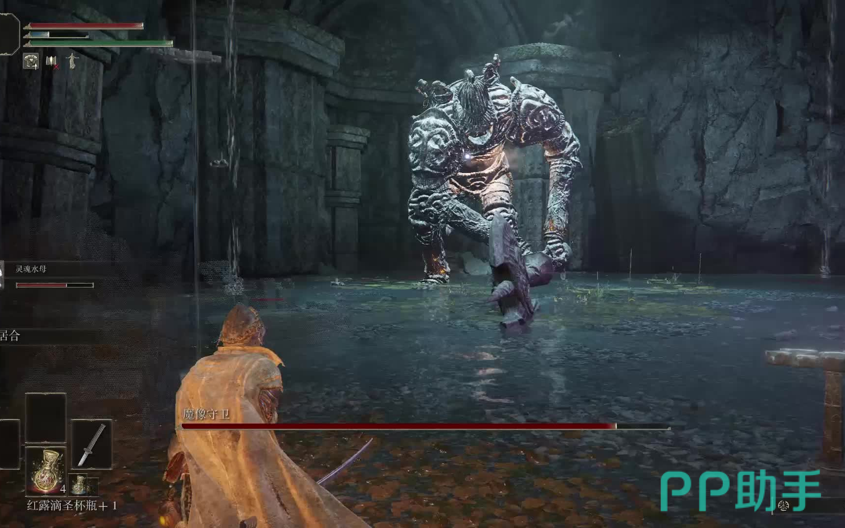 这里推荐大家用圣属性的巨剑去攻击这个boss,可以对石像类敌人造成更高额的伤害。然后再使用蓝色舞娘护符,可以获得更快地攻击速度。游戏内还存在其他类型的魔像守卫,建议优先解决,这样就能避免被围殴。