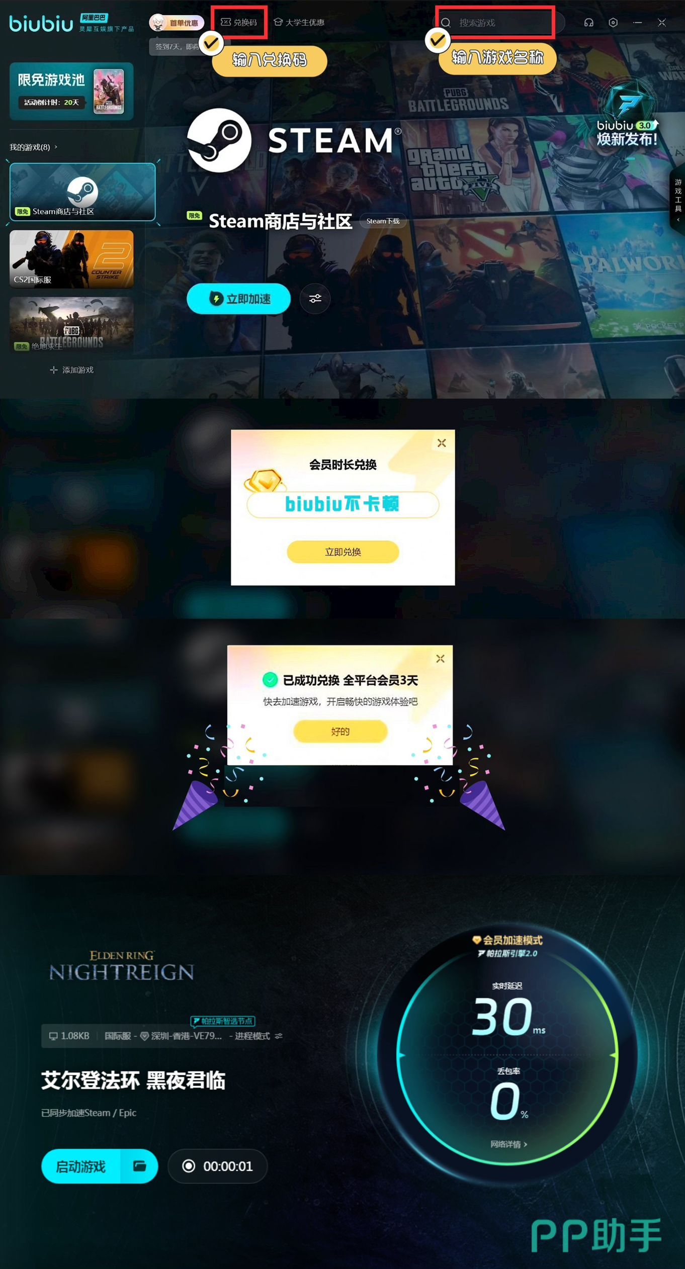 海量的网络节点和线路都是可以智能的筛选,让大家可以享受到稳定流畅的网络,并且现在对于新人也推出了注册直接领取24h奖励时间,平台的新老用户带着【biubiu不卡顿】口令,直接兑换到三天的继续加速权限,更让大家惊喜的是,该加速工具在5月30日-6月13日为该游戏开通了限免的福利,这样大家在跟好友享受练级组队不掉线的体验啦。