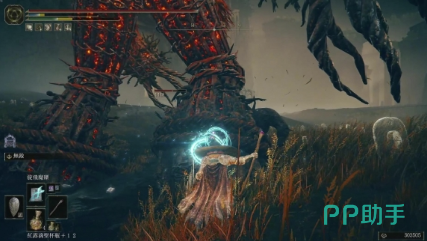 首要建议是装备“无敌战灰”,可以将它附着于任意盾牌上,利用这一道具来有效躲避火焰巨人的强力攻击——特别是它的双脚踏地技能。使用的时候可以在巨人双脚即将触地的瞬间激活战灰,可避免受到大量伤害。倘若你是一位法师,强烈推荐使用“旋飞魔砾”。这不仅能迅速使火焰巨人失去平衡,还能为后续攻击创造机会。对于非法师职业的伙伴们,则应携带具有高削韧属性的武器,以便更快达到失衡状态。