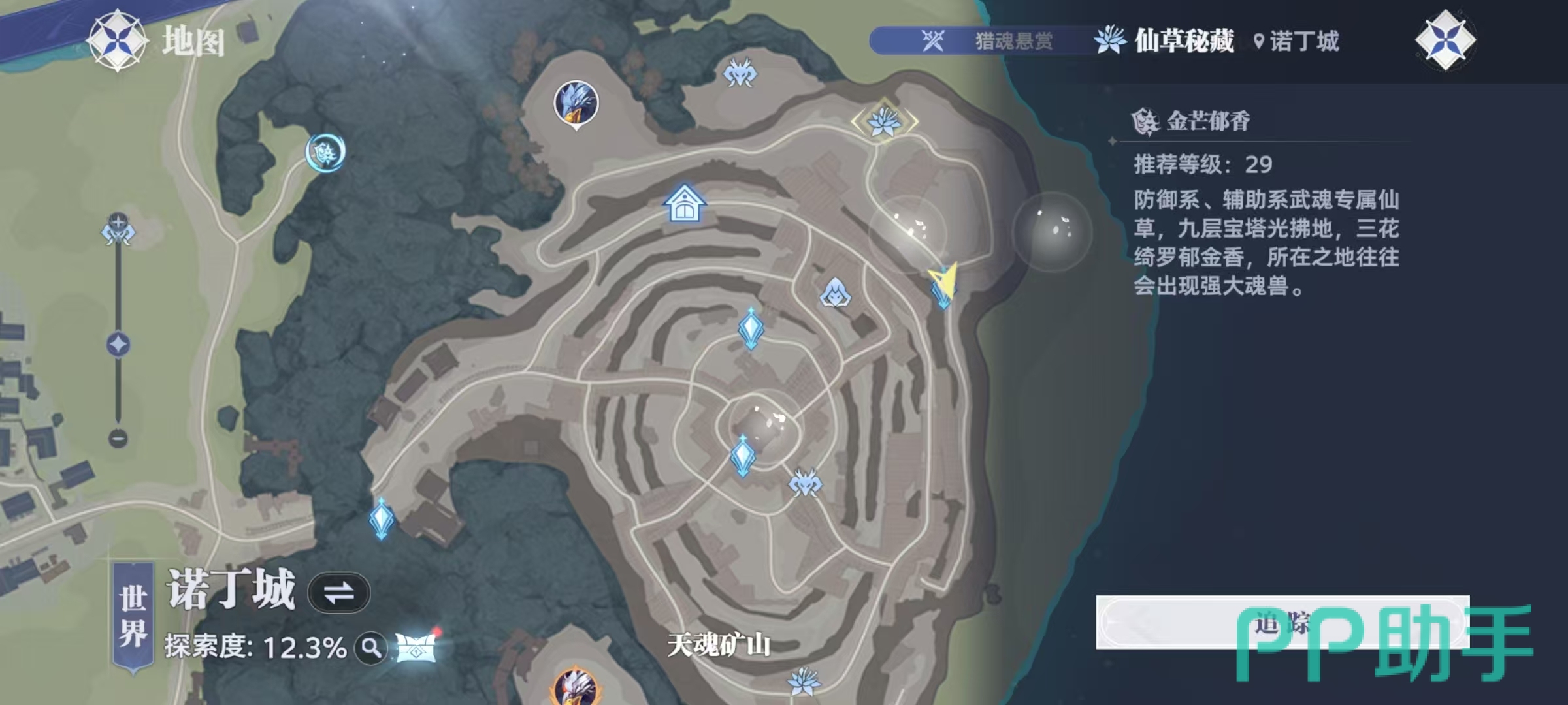 金芒郁香同样是防御系和辅助系武魂专属仙草,位于天魂矿山右上角角落。传送到矿藏区的传送点后,沿着矿山边缘探索即可发现它