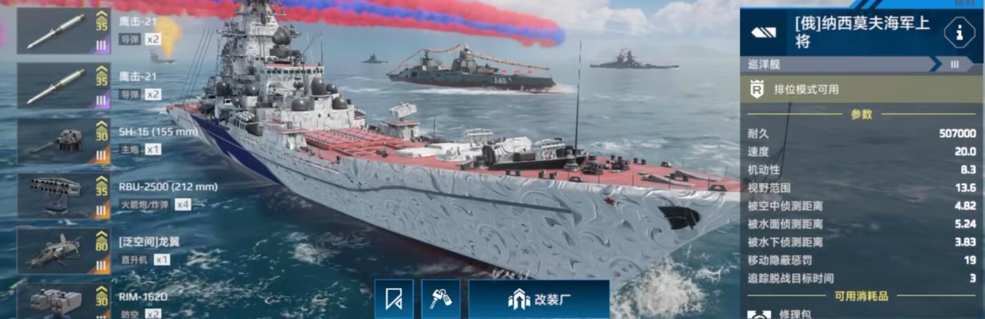 当敌方舰队残血或战局进入后期,可切换突击模式,利用燃气轮机加速逼近至8公里内,使火箭弹幕发挥最大穿甲效果。此时需注意损管系统的使用时机——当耐久低于30%时激活应急维修,可恢复18%最大血量,配合烟雾发生器实现绝地反击。但需避免被敌方潜艇或鱼雷舰贴身,否则高血量优势可能被瞬间瓦解。纳西莫夫其生存与输出能力过于强势。推荐搭配两艘佩里级护卫舰组成护航黑队,胜率极高,所以有机会大家不用犹豫,强度不会让你失望。