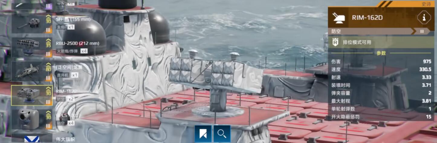 纳西莫夫的核心输出依赖3×22联装火箭炮+锆石高超音速导弹组合,火箭炮射程14公里,可对中距离目标造成持续压制,而锆石导弹则用于精确打击高价值目标(如敌方航母)。防空方面,配备海红旗-10近防导弹+智能化防空矩阵,可同时拦截32个空中目标,有效削弱敌方航空打击效率。由于缺乏原生反潜武器,建议搭配卡-27反潜直升机或依赖队友提供反潜支援。