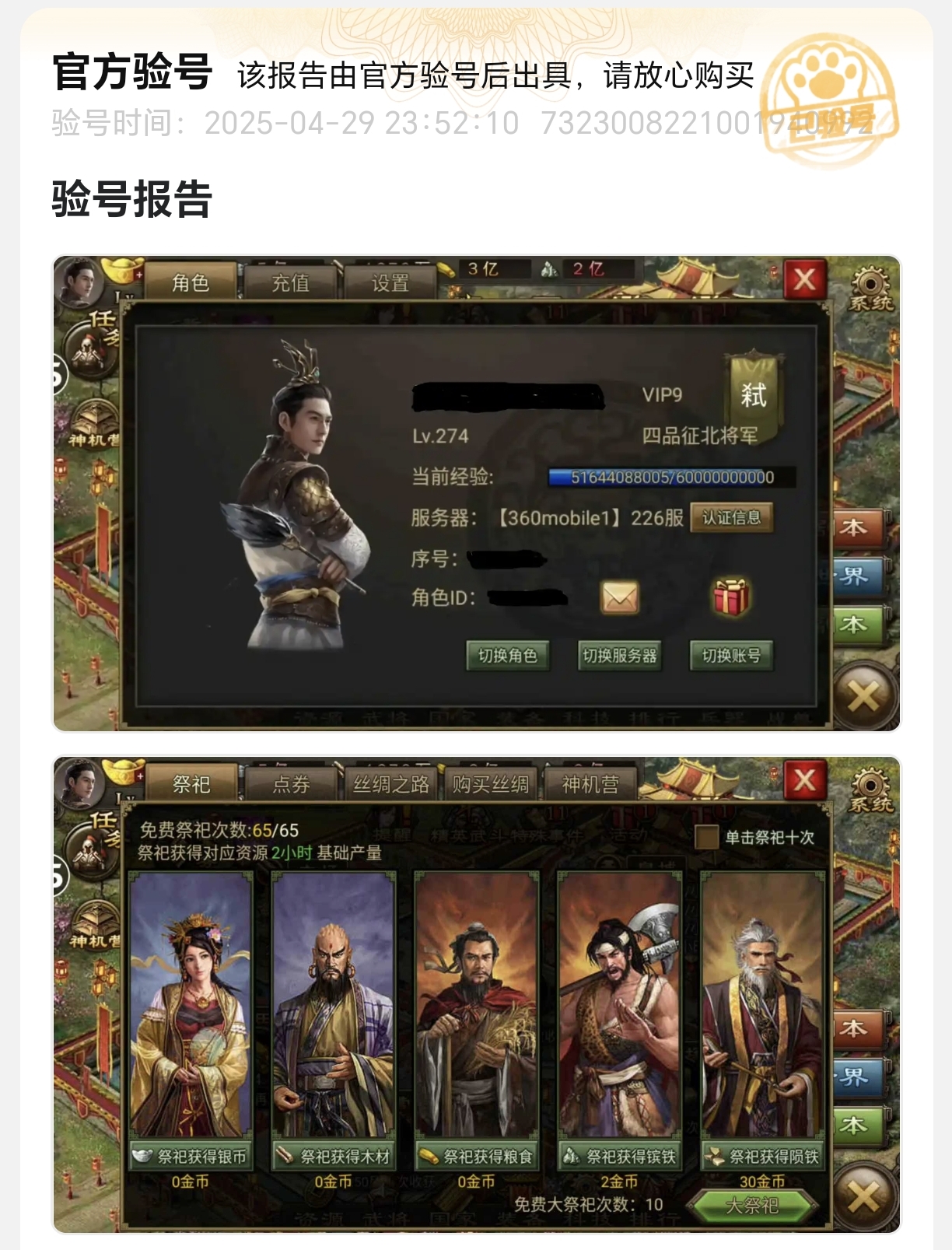 官方验号是交易猫保障交易安全的核心环节。验号过程至关重要,若出现疏漏,买家可能拿到与描述不符的账号,卖家则有信息泄露的隐患。交易猫由专业客服亲自登录账号,详细核查并截图关键数据,制作成验号报告,让买家全面掌握账号真实状态,既有效减少交易纠纷,也保护卖家隐私安全。