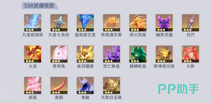 目前游戏里SSR级的武魂有九宝琉璃塔、九星七杀剑、蓝电霸王龙、奇茸通天菊、邪火凤凰、幽冥灵猫、月刃、火龙、柔骨兔、金羽猫鹰、死亡蛛皇、碧磷蛇皇、乾坤混元锁、火影、妖狐、香肠、鬼魅、天乾白玉鼎。