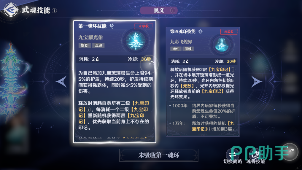 这其中九宝琉璃塔是最新的武魂,有限定抽取up,这是一个辅助系的武魂,普攻远程伤害,先机技攻击并获得一层九宝印记并升级该印记,印记的效果是6种不同属性力、速、魂、御、攻、增,其中一种并且持续2分钟。魂技则是给自己添加30秒的增伤,同时回复200点的魂力值,升级还有护盾、提升魂力恢复量、全能状态下的增伤效果。解锁被动效果后则是当获取6种不同印记后立刻将所有印记升到2级,进入全能状态。奥义则是给自身添加高额的护盾,护盾期间有霸体。也可以在解锁第四魂环后切换为生成5秒无敌光环。