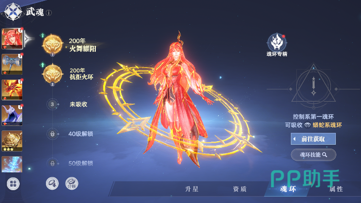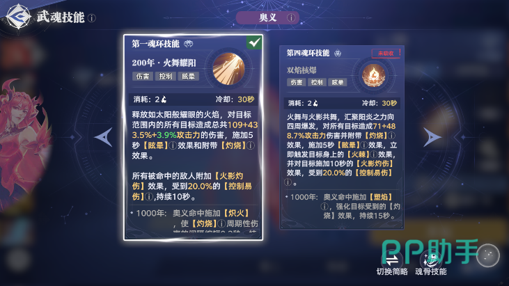 武魂的被动,属于是常驻的被动触发的效果,比如说火影的被动是魂技能和奥义可以叠加一层火棘,拥有该buff效果的敌人在受到灼烧伤害的时候,会有额外的伤害和控制易伤。武魂奥义则是能彰显武魂特性的主要技能了,通常是需要消耗魂力的,多为一次高倍率伤害技能,也可以在解锁额外的魂环后切换成其他奥义。