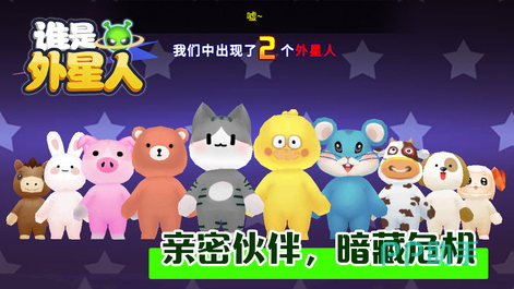 这款包含推理解谜的趣味手游,采用Q版画风设计了高清的3d形象和场景,为玩家们打造了丰富的小动物、外星人形象,通过各自的任务完成推理。每个人的身份均采用随机分配的方式,增加了趣味性和公平性,玩家们可以采用踢人和投票的方式,逐渐淘汰选手,直到发现神秘的外星人卧底,而外星人需要伪装自己,同时也要干扰其他任务的进程,