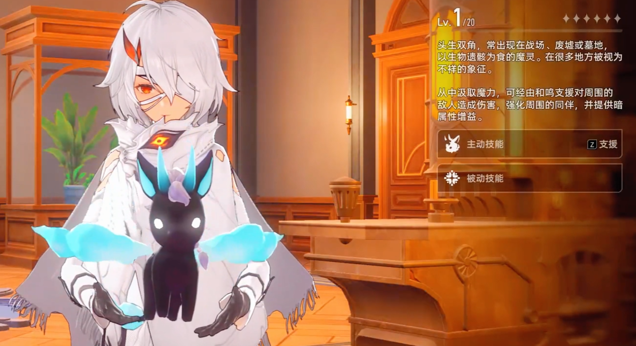 捕捉到的宠物,可以在整备界面的魔灵处查看,它们每一只有自己的主动技和被动技,选择一只出战,在战斗的时候可以释放出它们的主动技,带来各种战斗效果,被动技则通常是一些增益作用,比方说打火鸡作为火属性,它的被动就是增加5%的火属性攻击力。