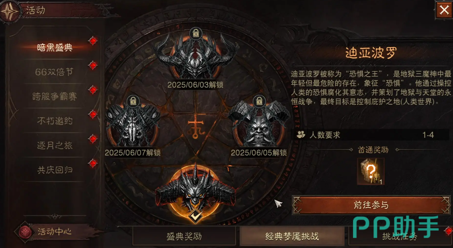在活动期间,大家可以参与经典梦魇挑战,在其中大家需要挑战四位传奇首领,他们分别是迪亚波罗、斯卡恩、屠夫和巴尔,首次挑战成功,不仅能获得传奇装备一件,还能完成暗黑盛典中挑战任务,累积奖励进度。