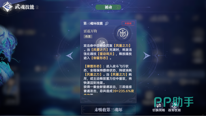 奥义是从高空砸向地面的大范围伤害,解锁第四魂环后还可以使用另一个奥义,降下数道落雷同时攻击周围目标,如果已经解锁雷霆万钧则会进入御雷形态,恢复50%的风雷之力,这个奥义还有二段,伤害倍率也很高,但使用后会立刻退出御雷形态。