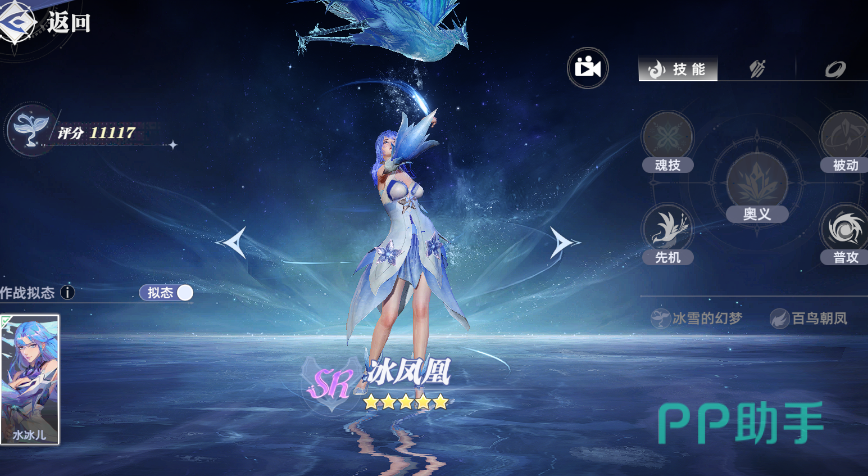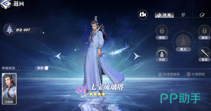 这里推荐的搭配为月刃+七宝琉璃塔(宁风致)+冰凤凰(水冰儿)+九星七杀剑(尘心)。这里的九星七杀剑就是尘心,游戏里有一个拟态功能,开启之后就可以切换到尘心的造型,不开启的话则是默认玩家创建的魂师形象。