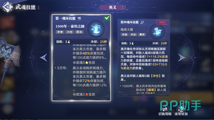 吸收魂环可以解锁更多的技能,强化专精魂环将其进阶到更高年份的,乃至5万年的则可以解锁技能更强力的效果。每个武魂有不同的普攻模组、被动效果、魂技、奥义,其中奥义还可以通过吸收第四魂环获得进一步强化。