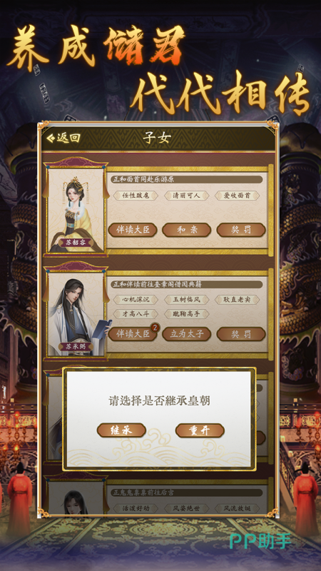 在你的眼前是高呼着万岁的文武百官,你将以君临天下的身份俯瞰着他们,当你处理完朝政上的忙碌,在后宫的另一个世界,那些神秘诱人的妃子,将成为你的温柔乡供你享用,当皇帝可以自由封妃的游戏有哪些就是这些了。