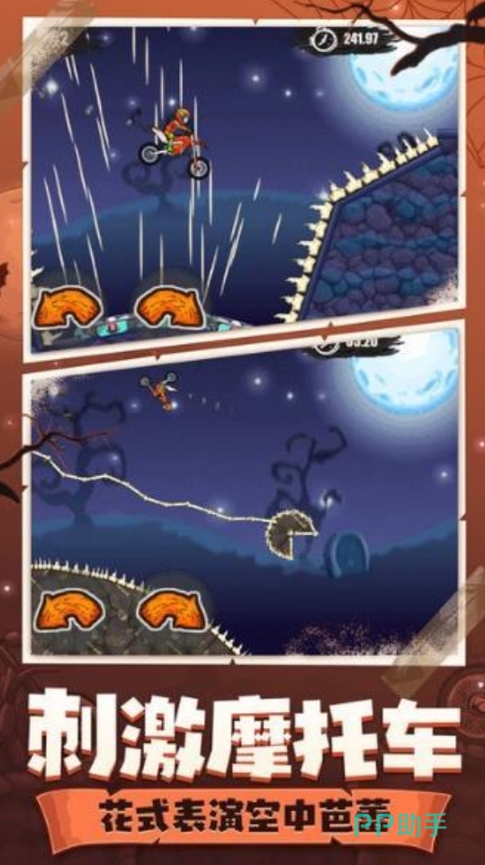 这是部万圣节主题的趣味摩托车游戏,它里面的跑道都有着很浓郁的节日元素,搭配上设计优秀的赛道关卡,令游戏体验起来既刺激又让人紧张,玩家们也将在游戏里驾驶着摩托车奔驰在各越野赛道上,如同走钢丝一般通过重重阻碍和陡峭山体并抵达终点。除了最初的摩托车外,游戏内还有多辆好看的摩托车可供解锁,收集起来也不麻烦。