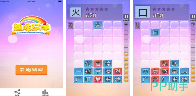 趣味汉字,非常适合汉字学习阶段的玩家来尝试,游戏开始之后会从天而降各种不同的偏旁和部首,玩家需要通过点击的方式把这些偏旁部首组合成汉字,也可以选择趣味性更强的消除模式,洛克会给出一个汉字,需要在左侧找出能与之匹配的偏旁部首,通过点击就可以被消除,达到对应的消除数量之后就能顺利通关。