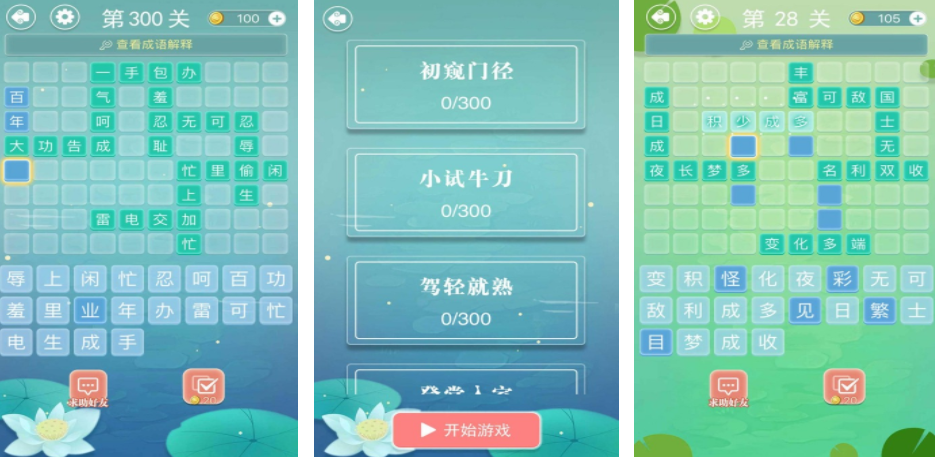 成语接龙是非常受欢迎的一个游戏,里面会分成多个不同的阶段,每一个阶段都有300个关卡,进入到关卡之后,玩家可以看到大量缺失部分汉字的成语,这些成语有的会互相连接,共用一个汉字,玩家需要做的就是,把下方空位中的汉字填写上去,组合成完整的成语,能通过这种趣味的接龙,掌握更多的成语知识。