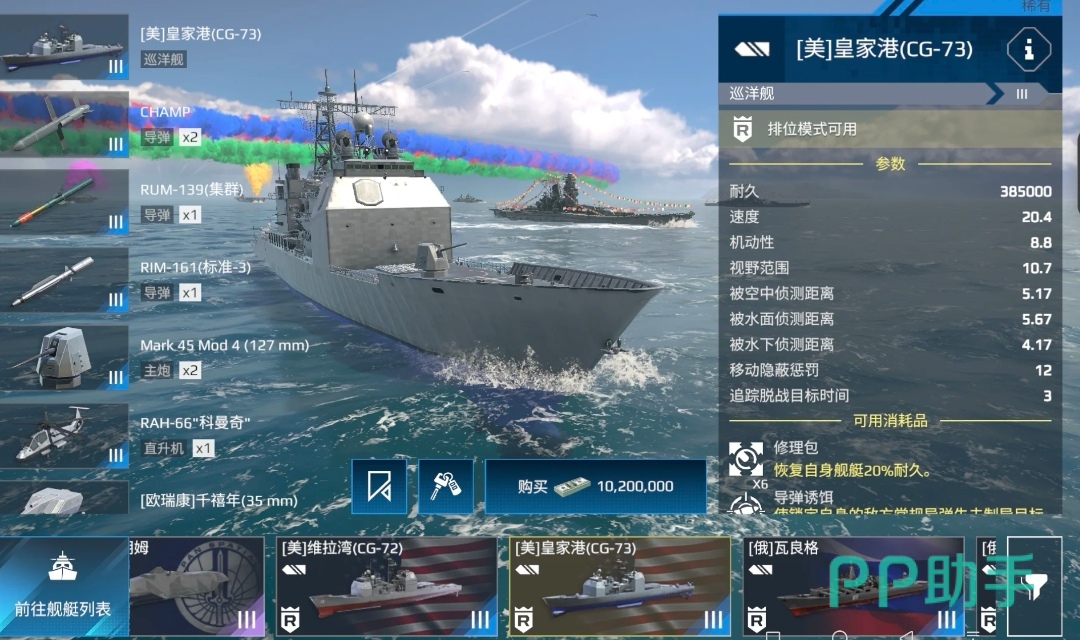 该游戏的背景是以现代海战为主题的,包含几百种舰船及导弹、电磁炮等装备,强调战术搭配与真实操作体验。当各位处于游戏的初始阶段时,小编是建议各位去购买皇家港(CG-73)、南昌(005型),或者是选择配备直升机的舰艇,譬如:056型或LCS-3型战舰,这几艘战舰的战斗力够高,有助于快速积累经验升级。