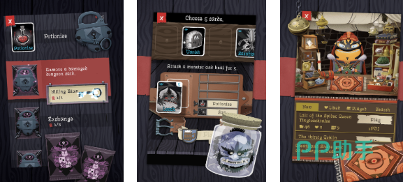 暗黑卡通风比较突出,玩家将在一场又一场的桌游中感受到卡牌的魅力。在抽象化的设计下,各种剑的图标代表武器,骷髅头则代表玩家要消灭的怪物。卡牌的类型较多,玩家可随机搭配不同的装备牌和地牢牌,你可能在卡牌消耗前走出地牢。卡牌具有一定的融合性,玩家可以将普通药水通过合成得到大药水,整体的威力会更大。