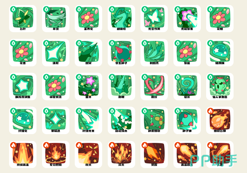 其次使用比较多的还包括草系技能、火系技能,如顶端优势、芳香诱惑、飞叶这些草系技能。又抑或是充分燃烧、吹火、淬火这些火系技能,都可以辅助小精灵们全力奋战。