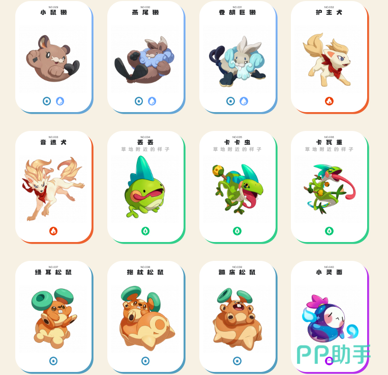 首先先来看一看精灵图鉴,在游戏中,目前设计了18种不同属性的精灵角色,并且在精灵类型上分为1级、2级、最终形态、地区形态和首领特殊形态这几种。比如小鼠獭,它可以进化成鼠尾獭,卷胡巨獭,而种族值也会随着它的进化不断提升,但是其特性却永葆不变。这个小精灵的特性是保守派总技能消耗小于三,防御提升80%。