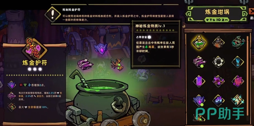 炼金护符可对角色的血量、防御、攻击力等基础属性进行显著强化,而这些属性的提升是增强角色战斗力的关键要素,佩戴契合自身战斗风格与关卡需求的炼金护符,能够大幅提升玩家在战斗中的生存能力与输出效率,部分炼金护符具有召唤毒灵协助战斗的能力,为玩家在战斗中提供额外的攻击手段,增加战斗的输出能力,一些护符能够对敌人施加中毒效果,使敌人持续受到伤害,在战斗中慢慢削减敌人的血量。