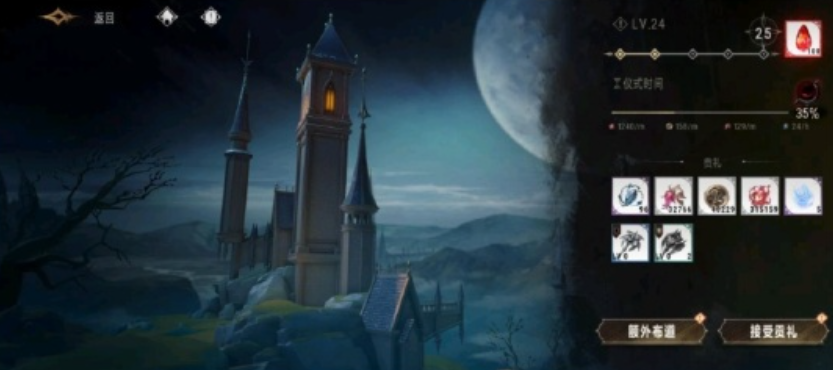 然后是古堡的盈月贡礼,这也就是前面说的收菜,每日只要布道就能自动产出养成资源,自身等级越高物资越丰厚,等级主要通过推进主线和困难关卡来提升,布道首次免费,第2次花费50钻,第3次70钻,第4次100钻,以此类推后面花费会越来越高,大家可根据情况来选择。