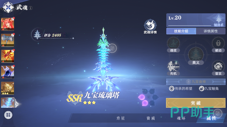 防御系的武魂目前还没出,重点看下辅助系的武魂,首推九宝琉璃塔,这个武魂可以降低魂力消耗,有护盾有无敌,并且可以给自己叠加各种增益效果。鬼魅也不错,有奥义的增伤和魂技的攻击转化血量。
