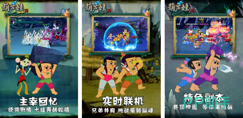 这款继承了国漫风格的葫芦兄弟IP游戏做工精良,多元关卡和特殊强化系统让玩家久玩不腻,极具创意的剧情演绎杜撰了葫芦兄弟的故事,萌宠收集的特殊系统则增加了游戏的耐玩性,异常凶险的内容塑造丰富了玩家的认知,组合队伍拯救爷爷的游戏性质也是葫芦娃的标配,你也试着在葫芦兄弟的帮助下完成任务吧。