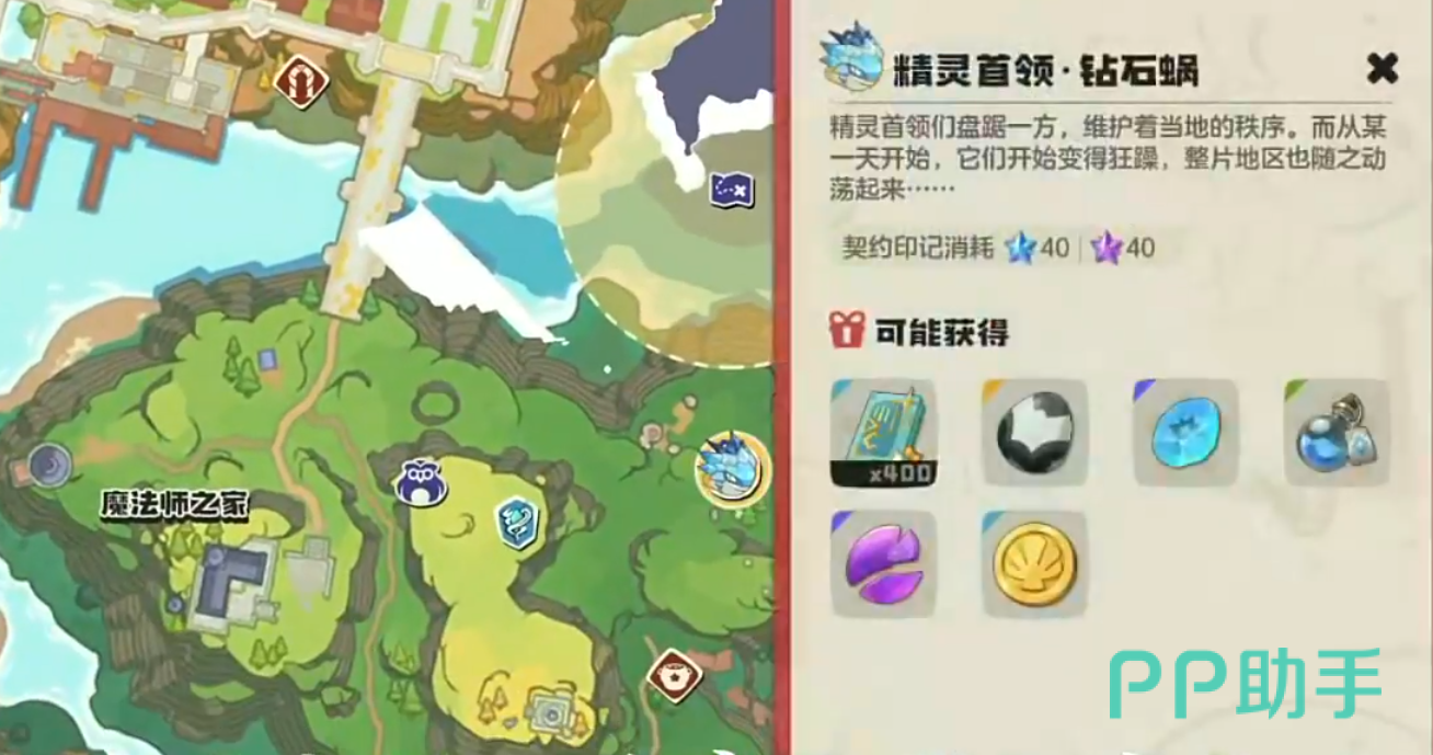 钻石蜗在魔法师之家的右边,它在一阶段会朝着我们释放三颗星星,这个可以通过向左右两边走位躲避,此外它还会释放三处从天而降的范围攻击,这个如果被打到了是没有办法立刻起身逃离的,所以一定要观察好地面的红色预警,避免被打中,将它的护盾值打掉后进入对战环节,该boss是地加光属性的,所以依然可以用草系的格兰球来进行克制,格兰球的特性是每次回合结束后回复血量,另外还有不消耗能量的草系技如汲取可以吸收伤害,再加上光能聚焦是可以轻松击败的。
