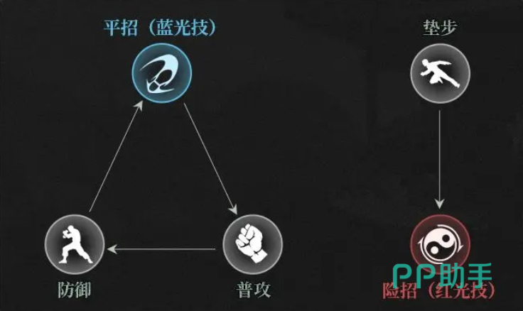 循环克制:普攻攻击被平招克制,平招可打断普通招式,反之行不通;平招被防御克制,防御又能防御平招,防御成功后还能选择防御反击或化解;普攻克制防御,普攻能破防并转化为投技。