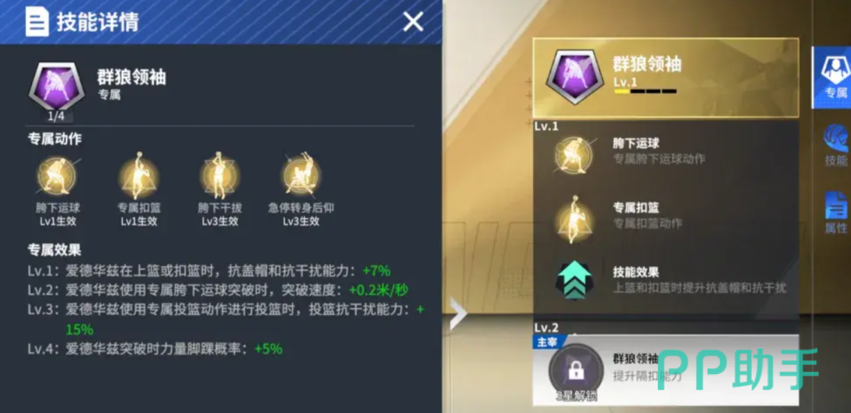 他的专属技“群狼领袖”,在一级的时候就会解锁专属扣篮动作一级胯下运球,并且还会上篮或者扣篮的时候,增加7%的抗干扰和抗扣帽能力,这样的专属外加额外加成,能保证在姿势帅气的同时快速得分。