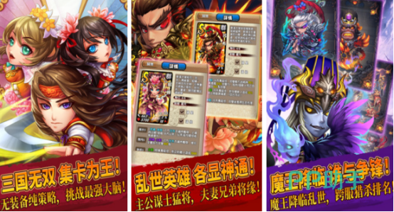 作为具有热门题材的三国卡牌策略游戏,拥有超级炫酷的战斗系统,玩家可以使用特定的武将自由搭配,并激活伤害较高的大招。游戏推送出深度社交以及军团玩法,通过竞拍分配出稀有道具。内置跨服竞技抗战pk等等游戏也会不定期更新,增加与玩家之间的粘性。