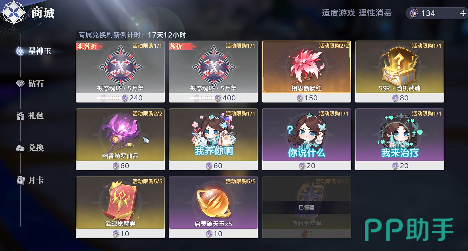 然后还有其他类型的道具,大家可根据自身需求选择,如果缺少武魂的话就可以购买随机的SSR武魂。第二种就是钻石商店,钻石便是在游戏中获取的一种更高级的货币,可按需兑换各种道具材料,方便各位培养角色或者武魂。另外还能使用其他物品,随心兑换各种高价值道具。