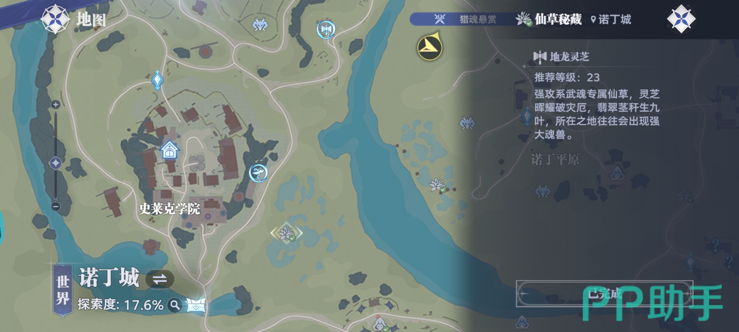 在诺丁城地图中,地龙灵芝的位置非常容易找到。玩家只需前往史莱克学院,来到其右下角的池塘附近,就能轻松看到采集点。这是新手玩家最容易获取的一个点,几乎无敌人干扰,推荐优先前往。