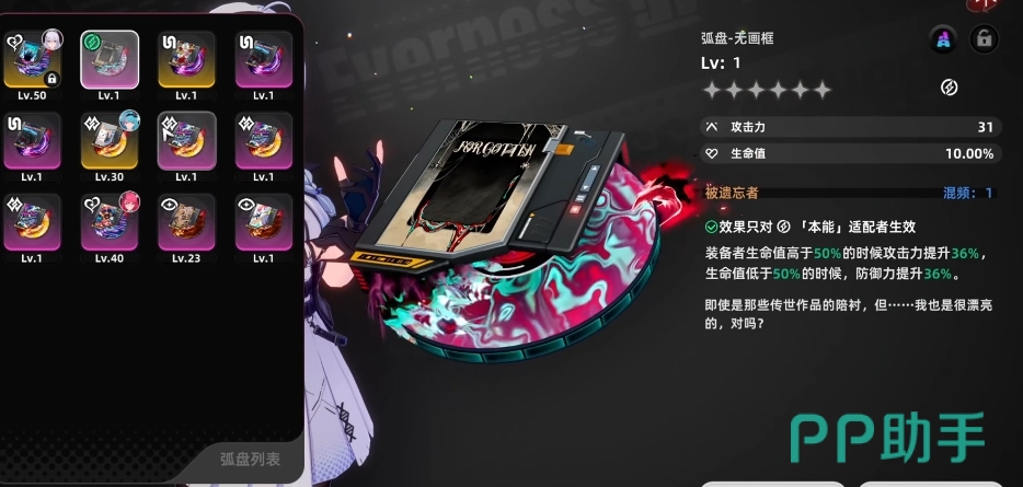 无画框这件武器是很多玩家前期都会选择使用的,其精通效果与装备者的生命值状态有关联,当装备者生命值高于50%时,无画框便摇身一变,成为提升攻击力的得力助手,为装备者在生命值较为健康的情况下注入强大的输出动力,而当生命值低于50%时,它又适时地转换角色增加防御力,并且随着精通等级的提升,这种攻击力和防御力的加成效果也会从精通1时的36%一路飙升到精通5时的72%,无论是进攻还是防守,都能让装备者在不同生命值状态下都能找到最契合的战斗节奏。