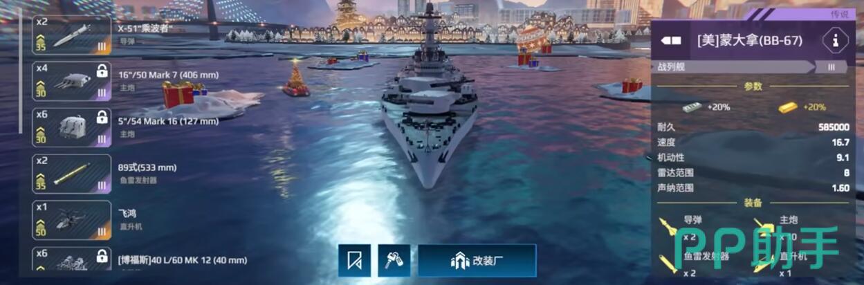 装备搭配推荐:导弹:CHAMP导弹射程远、伤害稳定,适合优先打击敌方战列舰或航母。若追求爆发,可替换为“锆石”高超音速导弹。主炮:406mm舰炮穿甲能力强,但装填较慢(约25秒),建议搭配火炮装填加速插件提升DPS。鱼雷:Mark 48鱼雷射程适中,适合伏击靠近的驱逐舰或潜艇。防空:海拉姆+萨德组合可应对大多数空袭,但面对X级航母时仍需队友支援。直升机:RAH-66科曼奇提供侦察与反潜能力,适合探测敌方潜艇位置。