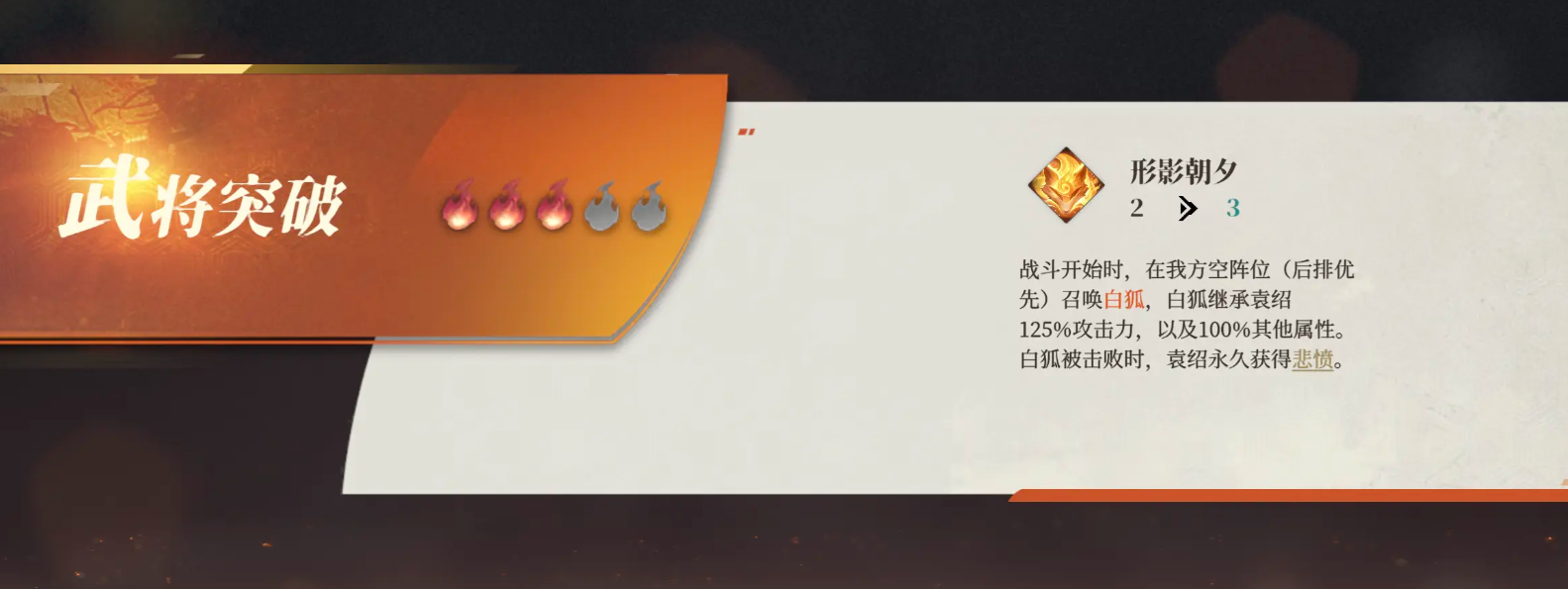 突破技则是袁绍和白狐都可以对血量比例较高的目标提供增伤,当袁绍血量降低到一定比例时,白狐会对目标使用绝技。天赋则是开局就可以召唤白虎,并且白狐能继承袁绍的属性,并拥有新的技能。白狐如果被击败则会永久降低袁绍的绝技战意消耗。