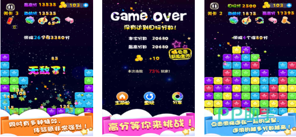 这款消除星星的休闲互动游戏带来无比解压的感觉,玩家要尝试点击不同颜色的星星方块进行消除,两个以上的星星相互连接就可以直接消除掉,简单好玩的消除设定让消除游戏粉丝爱不释手,更有一些难度极高的消除模式增加了耐玩性,绚丽多彩的美术背景也为玩家提供了视觉上的享受。