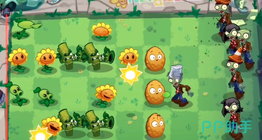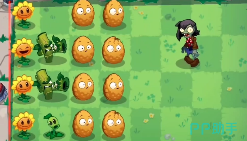 到了第十关,游戏的节奏开始变得有些不一样了。从这关起,你会发现所有的道路都可以自由使用,不再是单一的路径选择。游戏一开始系统会在你面前布置一些坚果和向日葵,但很显然,坚果的作用被限制了——因为这一关无法使用坚果。尽管如此,你还是可以将它们用作策略性摆放,保留几个坚果在前方,用作缓解压力的临时防线。游戏初期你需要依赖向日葵提供阳光,而豌豆射手和竹筒炮则是你稳定防线的核心。当你成功在每一行都布置好豌豆射手后,接下来就是利用阳光的优势,慢慢扩展你的植物阵容。
