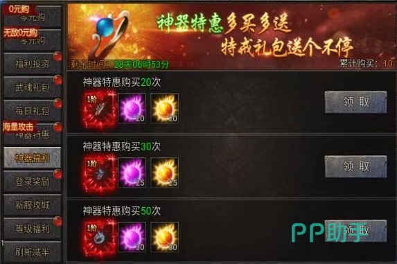 虽然神器也是百分比属性加成,但是后期的属性并没有武魂提升的多,而且进入地图不会受到神器方面的限制,而会受到武魂的限制,所以武魂要比神器优先级更高。在游戏中还有一个战力很关键的方面,容易被大家忽视,那就是4个特戒属性,这4个特戒分别是麻痹戒指,冰冻戒指,复活戒指和鞭策戒指,这4个戒指都是有着特定的属性。大家一定要尽快凑齐这4个戒指,然后看个人需求,可以去选择性的购买神器礼包,在达到相应购买次数之后,就去神器福利里面领取。