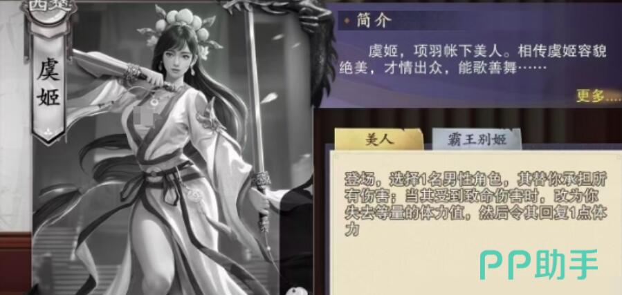 虞姬的一技能“美人”是她的核心生存手段,效果为选择一名男性角色承担所有伤害,但虞姬自身会等量损失体力值,同时该男性角色可回复1点体力。这一机制的关键在于选择合适的承伤目标,优先推荐高防御或高血量的男性角色,如满星陆逊,其群体输出与承伤能力可完美适配虞姬的联动需求。需要注意的是,若敌方爆发过高,单次伤害可能导致虞姬与男性角色同时阵亡,因此需合理控制承伤节奏,避免过度依赖转移伤害。