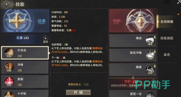 如果选择走守护路线,那么就要做好成为团队壁垒的准备,核心技能是盾击,这是起手技能,可以眩晕敌人,并且嘲讽强制攻击自身,为队友创造安全的输出环境。第2个核心是盾牌格挡,大幅度提高自身的格挡率,减少受到的伤害。第3个核心技能则是生命强化,提高自身生命上限,加强生存能力。