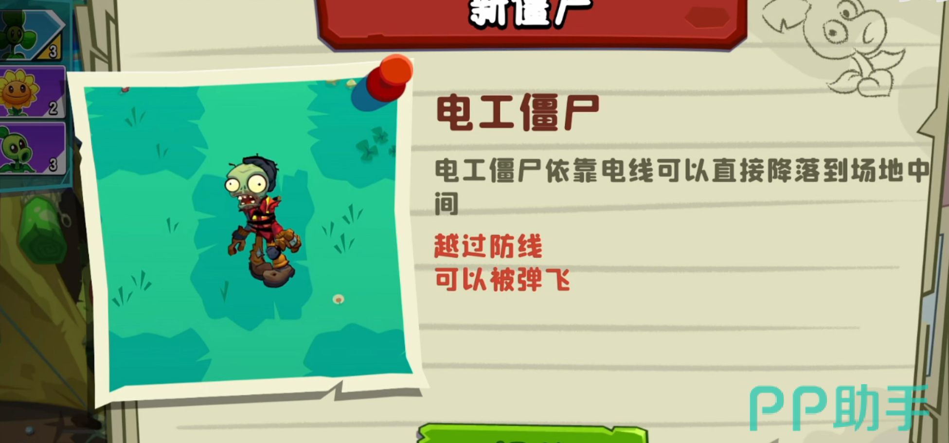 电工僵尸:电工僵尸可以利用电线越过植物防线直接降落到场地中间。而且还会释放闪电,对周围植物完成伤害。不过电工僵尸可以被弹飞,可以利用这一点来进行克制,再配合攻击力高的植物将其击败。