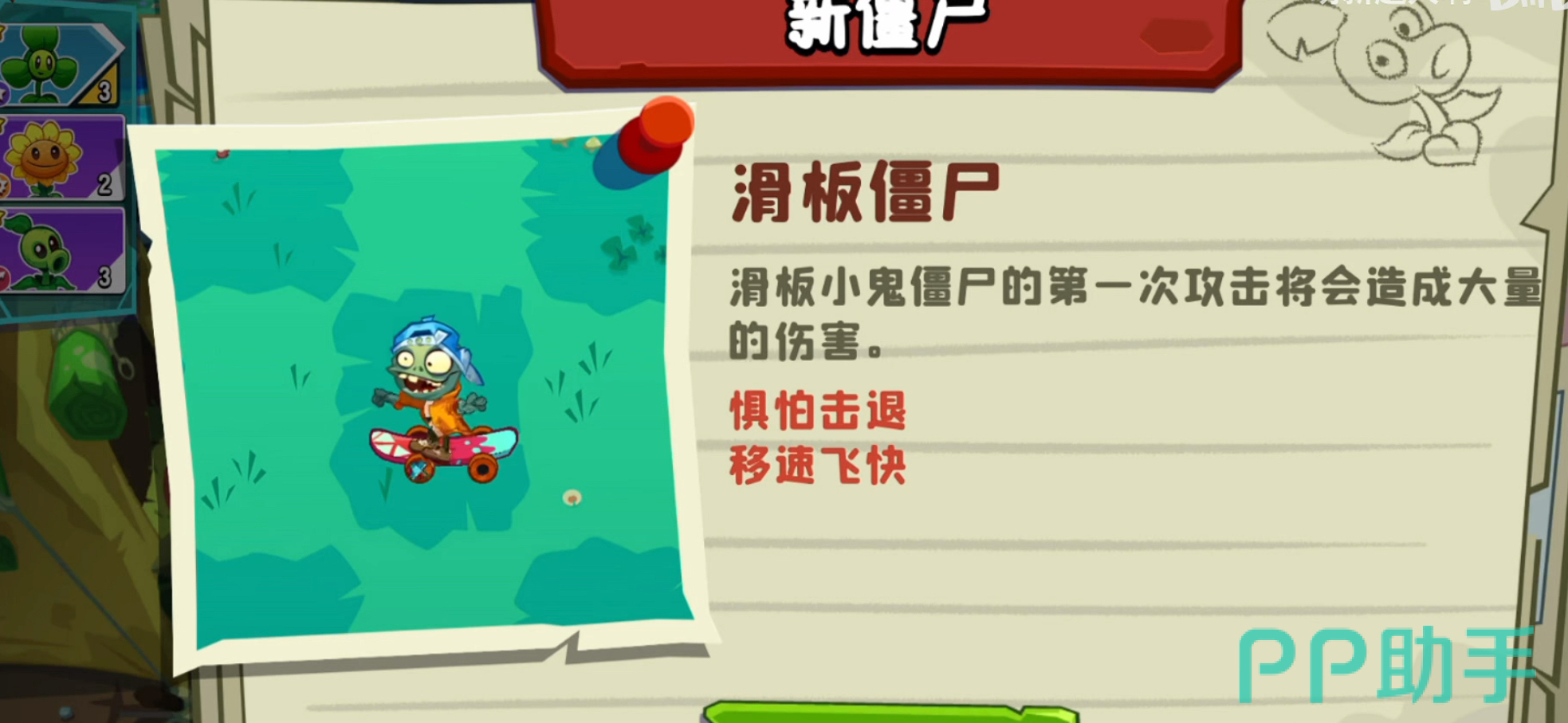 滑板小鬼僵尸:滑板小鬼僵尸的第一次攻击会对植物造成大量的伤害,而且它的移速非常快,血条也非常厚,特别难对付。因此想要有效击退它,需要在前排安排防御值高的植物来进行阻挡,如高坚果,然后再安排攻速快且伤害范围大的植物对其进行减速和伤害,比如豌豆射手和火炬树桩等。