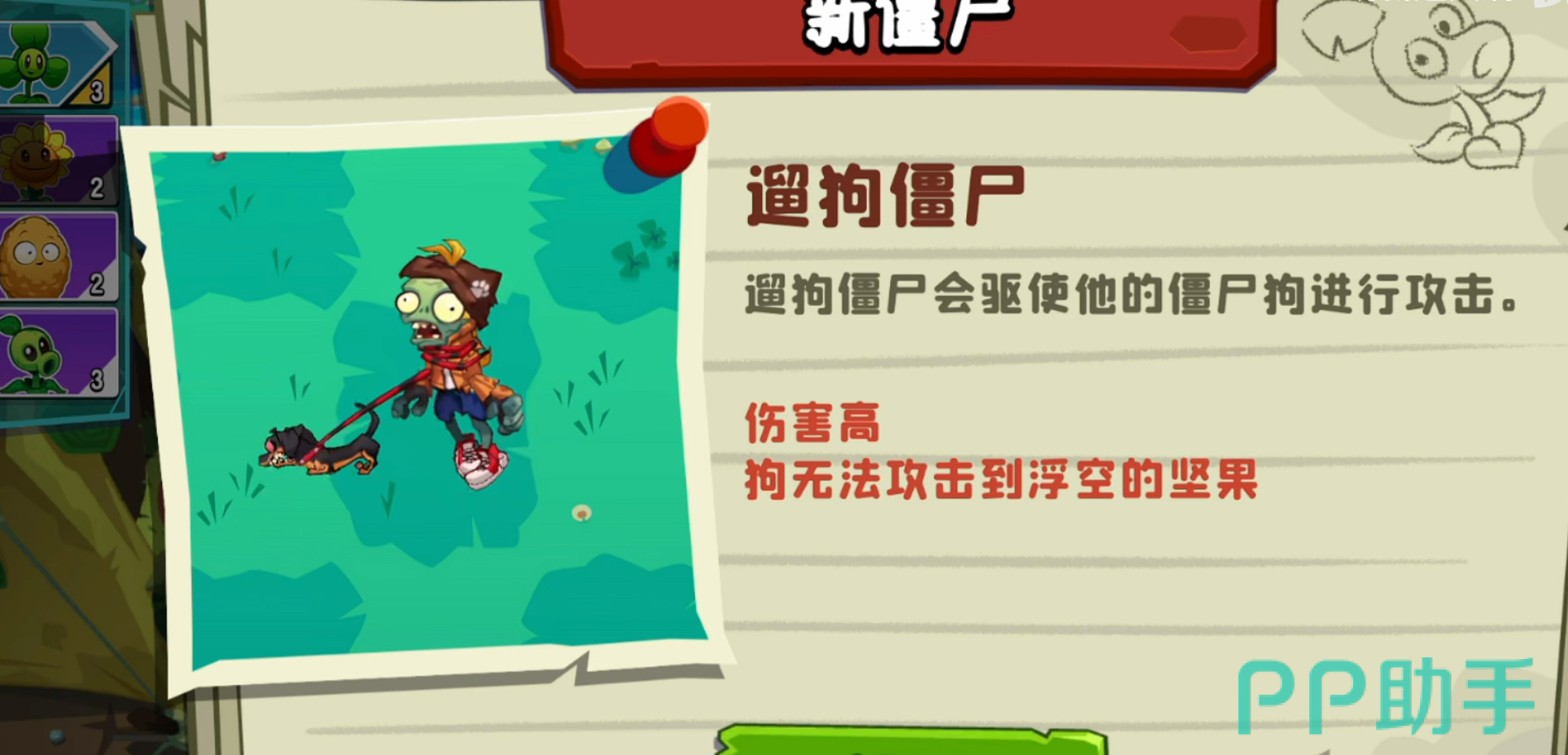 遛狗僵尸:遛狗僵尸会通过它手中的僵尸狗来攻击植物,而且它们的伤害非常高。不过其僵尸狗无法攻击飞行在空中的坚果,所以可以利用这一点来克制遛狗僵尸,以达到击败它的目的。