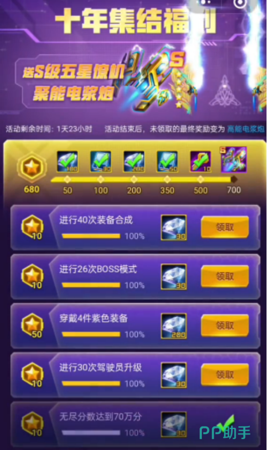 雷霆战机集结有多种每日必做任务,完成相应的任务之后,可以获得极其丰富的奖励,比如活跃任务完成,每天都需要参与到5次普通任务当中,就能够提升个人的活跃度。无尽模式挑战,此任务的完成方式较为简单,搭配分数加成20%道具在,在5~6个boss处刷宝箱后退出重开就能够将此任务完成了。