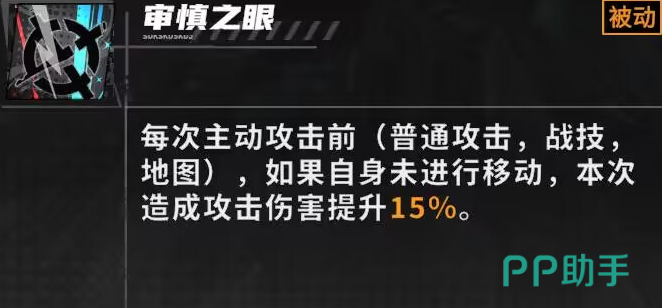 莱诺还具有叫做审慎之眼的被动技能。他能在每次发起主动攻势之时(涵盖普通攻击和施展战技以及地图交互攻击等情形),如果角色自身在攻击前未产生位移,那么此次攻击所造成的伤害将会获得15%的增幅。