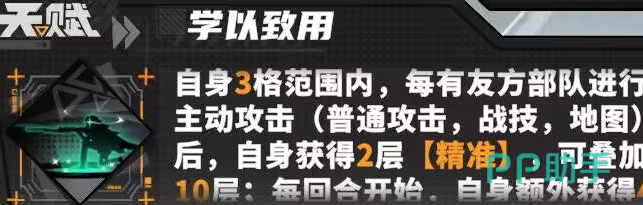 莱诺的天赋技能是学以致用。在自身周围三格的范围内,每当有友方部队展开主动出击(无论是普通攻击或者战技施展,还是在地图上发起攻击)之后,自身便会收获 2 层精准效果。这一效果可以不断累积,最多能叠加到 10 层。另外,在每一回合开启之时,自身还会额外获得 4 层相关增益。